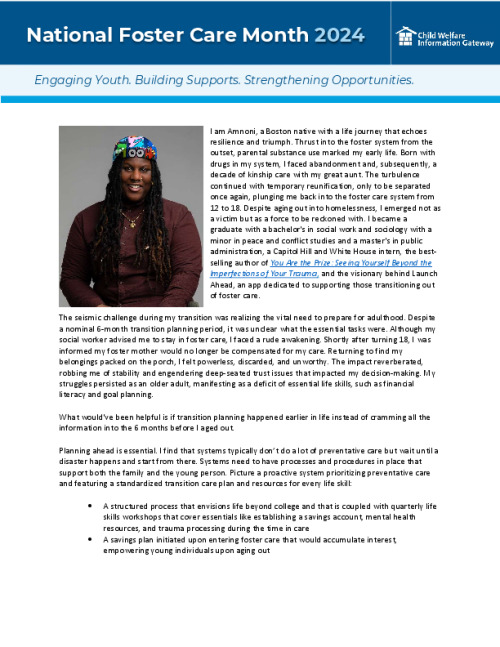 Download Publication Amnoni Story 2024 PDF-rem.pdf (PDF 889 KB)Amnoni shares how she emerged from the foster care system not as a victim, but as a force to be reckoned with. She highlights her transition out of foster care and identifies ways the child welfare system can better plan ahead and provide intentional preventative care to support youth’s long-term stability.